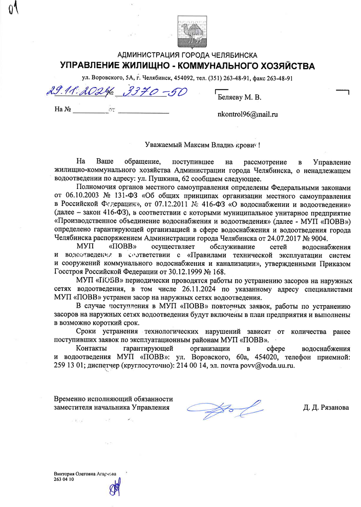 В ответ на обращение Управление жилищно-коммунального хозяйства города сообщило, что за водоотведение в Челябинске отвечает МУП «Производственное объединение водоснабжения и водоотведения». Ведомство пояснило, что 26 октября специалистами МУП был устранен засор на наружных сетях водоотведения по указанному адресу, однако, если проблемы с канализацией будут повторяться, дополнительные работы по устранению засоров будут выполнены в кратчайшие сроки.