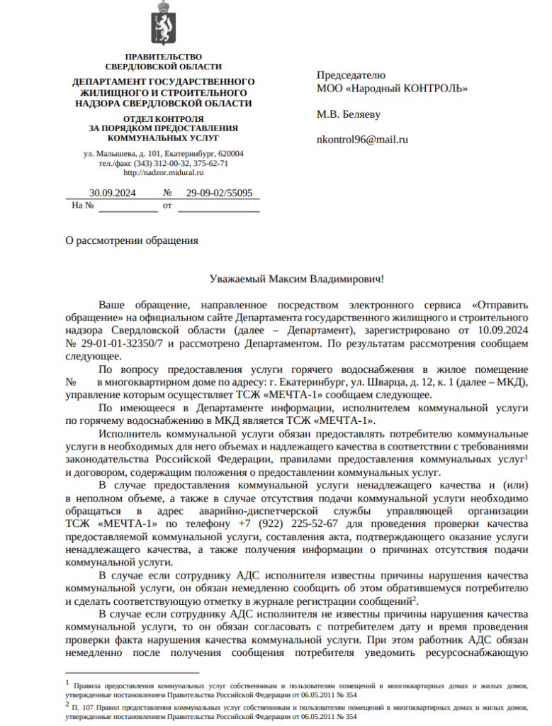 На обращение, полученное 30 августа из Екатеринбурга с жалобой на проблему с горячим водоснабжением, был получен ответ из Департамента государственного жилищного и строительного надзора Свердловской области.
