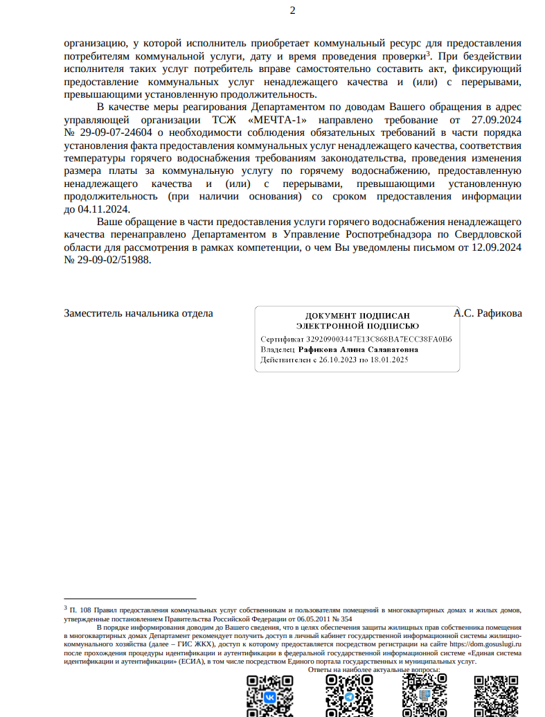 На обращение, полученное 30 августа из Екатеринбурга с жалобой на проблему с горячим водоснабжением, был получен ответ из Департамента государственного жилищного и строительного надзора Свердловской области.