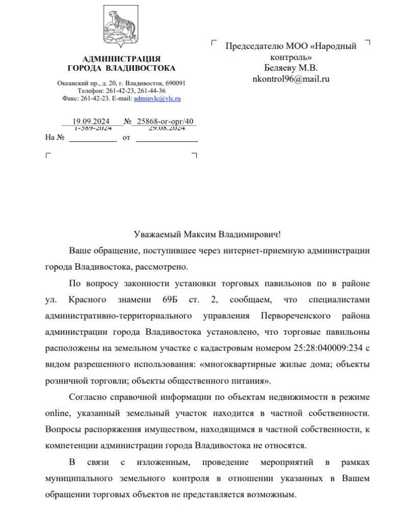 На это обращение был получен ответ от администрации города Владивосток. Администрация сообщила, что павильоны находятся на частной земле, предназначенной для жилых домов и объектов торговли, что ограничивает вмешательство со стороны муниципальных властей. Вопросы распоряжения частной собственностью не относятся к компетенции администрации, поэтому контрольные меры не могут быть применены.