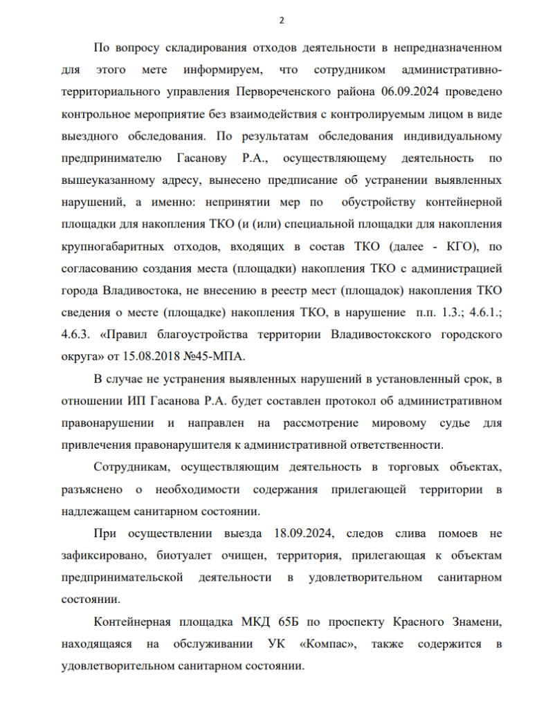 В конце августа было получено обращение с жалобой жителей Владивостока на антисанитарные условия и нарушение правил торговли между домами по проспекту Красного знамени, а также просьба улучшить благоустройство территории. Жители указывали на антисанитарные условия в магазине, завышенные цены, просроченные продукты, отсутствие кассового аппарата и уголка покупателя.