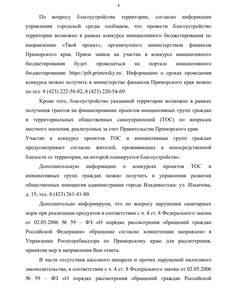 На это обращение был получен ответ от администрации города Владивосток. Администрация сообщила, что павильоны находятся на частной земле, предназначенной для жилых домов и объектов торговли, что ограничивает вмешательство со стороны муниципальных властей. Вопросы распоряжения частной собственностью не относятся к компетенции администрации, поэтому контрольные меры не могут быть применены.