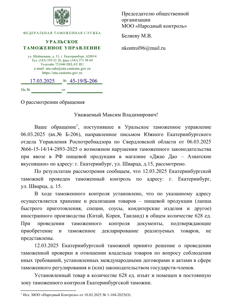 На запрос прокуратуры 6 марта 2025 года Уральское таможенное управление направило ответ, в котором указано, что 12 марта Екатеринбургская таможня провела контроль в одном из проверенных магазинов, расположенном по адресу ул. Шварца, 15.