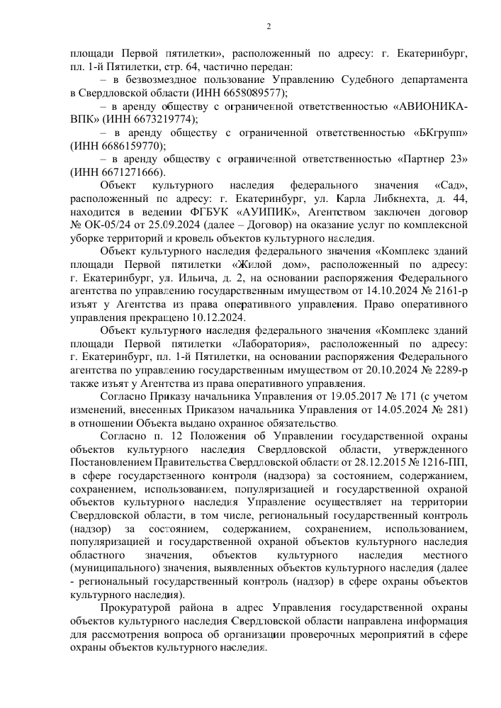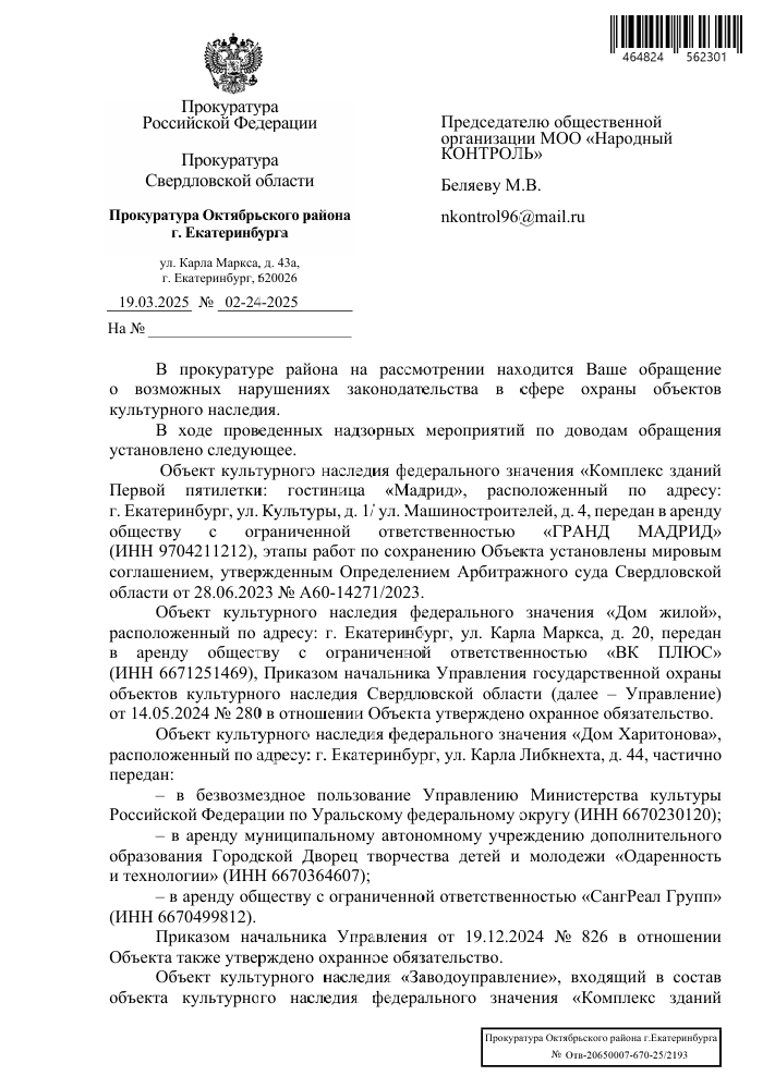 Прокуратура Октябрьского района Екатеринбурга, рассмотрев обращение, установила, что ряд зданий передан в аренду различным компаниям, но вопросы охраны и состояния этих объектов остаются нерешенными. В связи с этим прокуратура направила информацию в Управление государственной охраны объектов культурного наследия Свердловской области для дальнейших проверок.