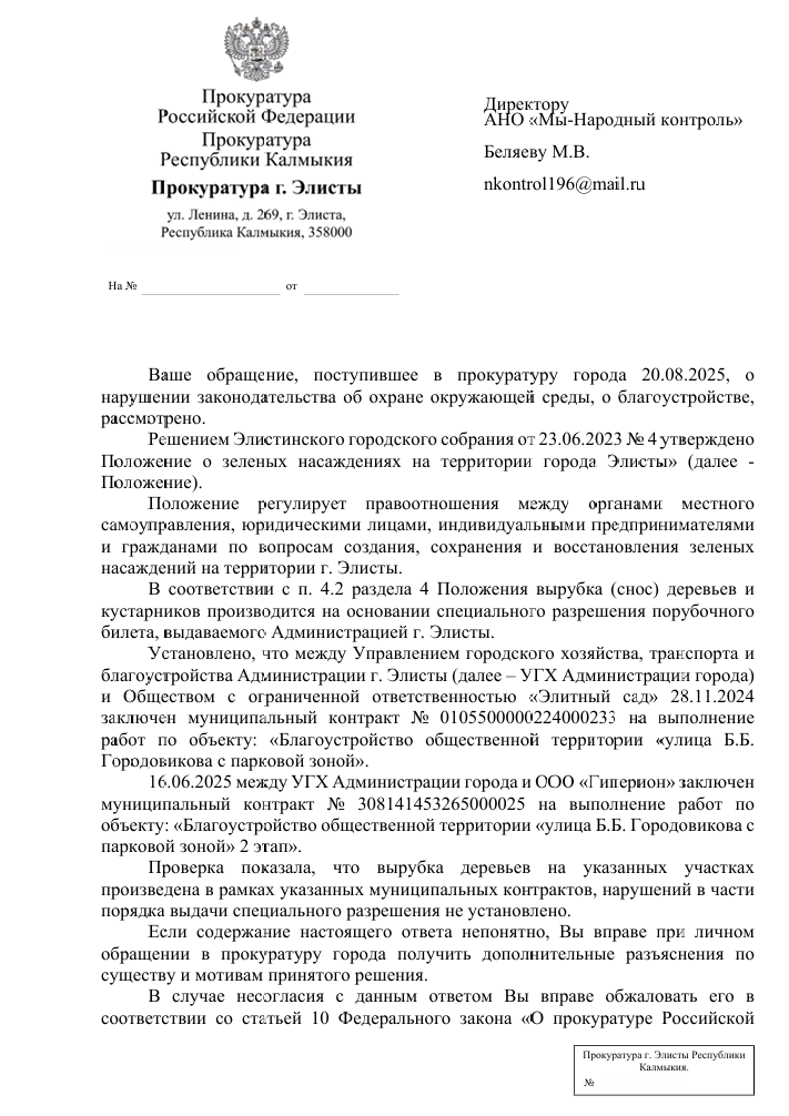 Прокуратура города провела проверку и сообщила, что вырубка зеленых насаждений проводилась в рамках муниципальных контрактов на благоустройство. Как указано в ответе, работы велись на основании разрешительных документов, выданных администрацией Элисты, а нарушений в порядке выдачи порубочных билетов не установлено.