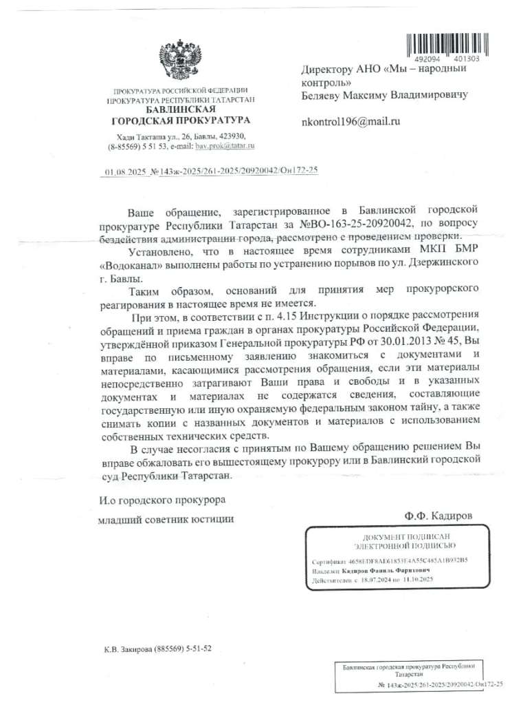 Бавлинская городская прокуратура Республики Татарстан провела проверку по факту бездействия местной администрации. В ответе, зарегистрированном под №ВО-163-25-20920042, указано, что сотрудниками МКП БМР «Водоканал» уже выполнены работы по устранению порывов на улице Дзержинского. В связи с этим оснований для мер прокурорского реагирования не найдено.
