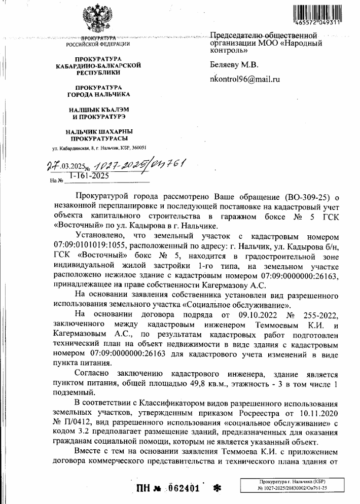 Из города Нальчик было получено обращение о незаконных действиях владельца гаражного бокса №5 в ГСК «Восточный». Согласно обращению, хозяин этого бокса снес несущую стену, надстроил второй этаж и открыл кафе без согласия членов кооператива и соседей, что нарушает правила использования земельного участка, предназначенного для гаражного строительства. Помимо этого, был засыпан и забетонирован участок, через который проходила ливневая канализация, что привело к нарушению водоотведения и затоплению подвальных помещений.