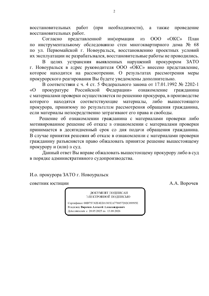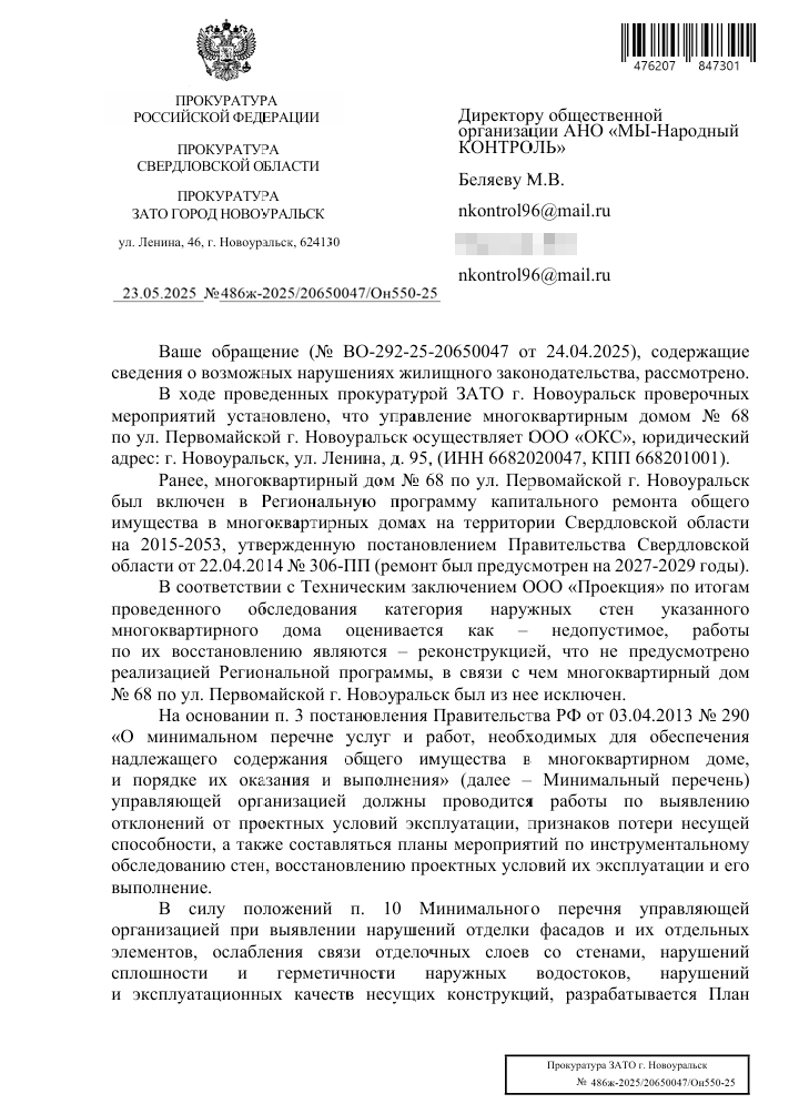 ОБНОВЛЕНИЕ: получен дополнительный ответ по данному вопросу — Прокуратура отчиталась о ходе проверки дома на Первомайской, 68 в Новоуральске