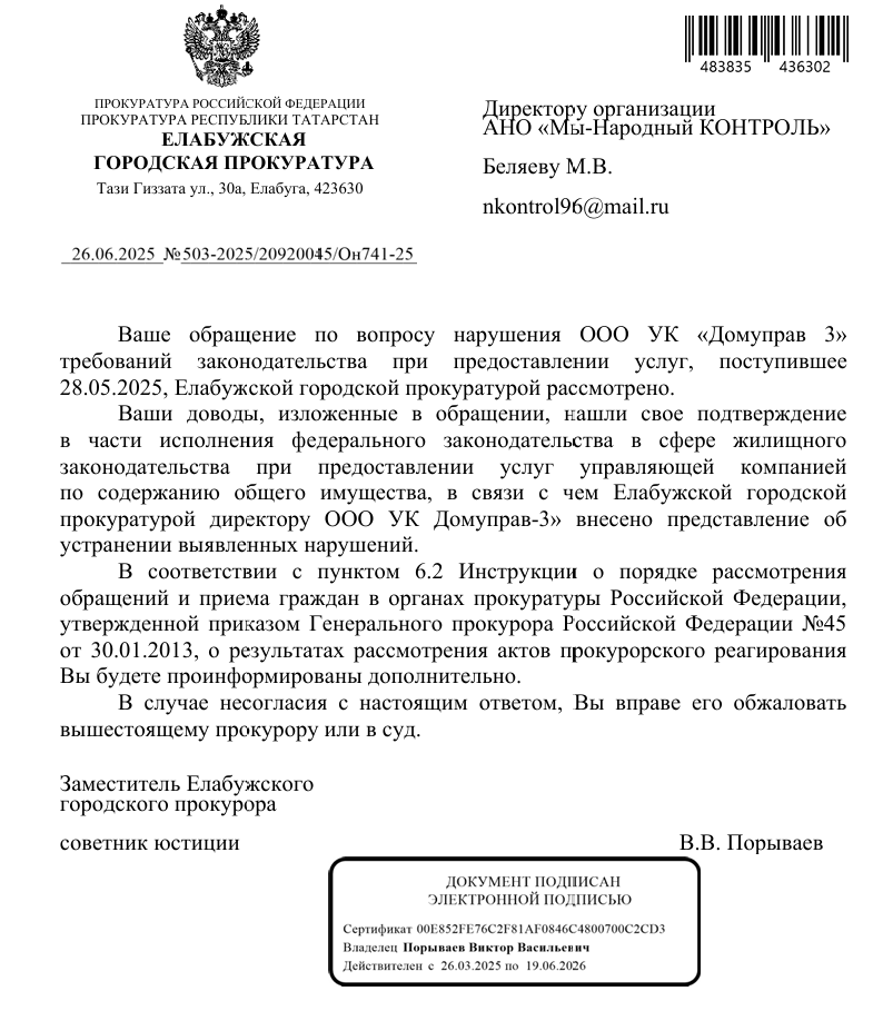 После поступившего обращения Елабужская городская прокуратура провела проверку и подтвердила нарушения в работе управляющей компании «Домуправ-3». В адрес её руководства было внесено представление об устранении нарушений, о результатах рассмотрения которого заявитель будет уведомлён дополнительно.