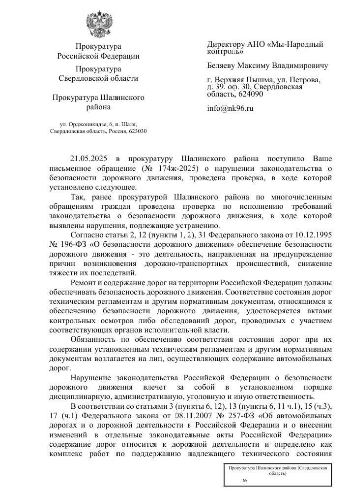 Благодарим неравнодушных граждан за Ваши обращения. Если Вы не согласны с данным ответом Прокуратуры Шалинского района, пожалуйста, сообщите об этом Нам (желательно с фото/видео доказательствами выполнения работы в неполном объеме или ее невыполнении).