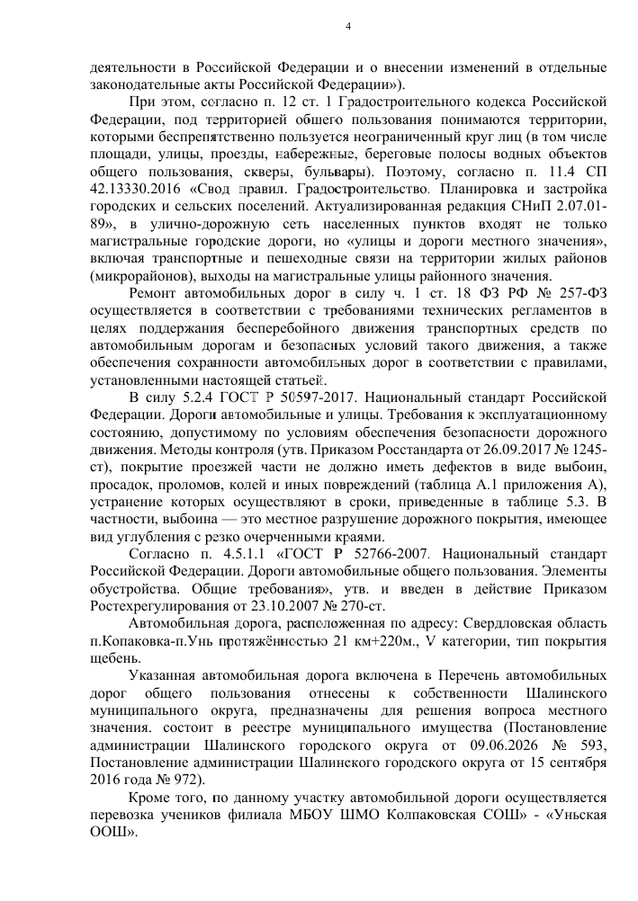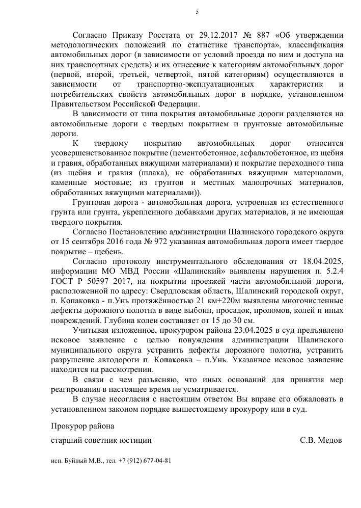 Учитывая выявленные нарушения, 23 апреля 2025 года прокуратурой было направлено исковое заявление в суд с требованием обязать администрацию Шалинского МО устранить выявленные дефекты и восстановить проезжую часть на указанном участке.