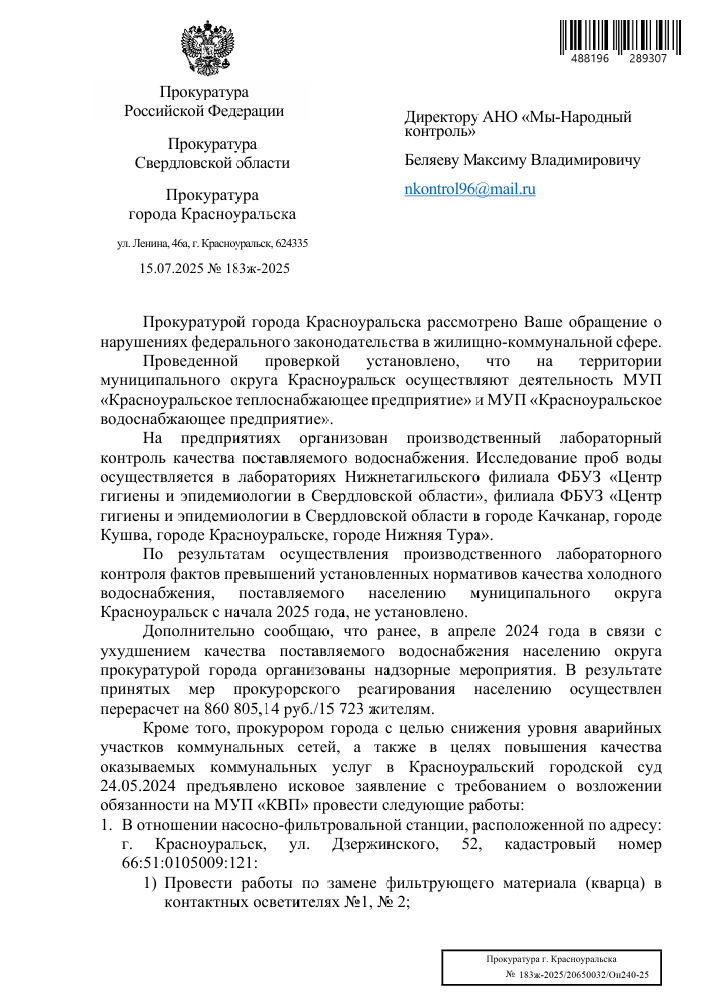В июне из города Красноуральск было получено обращение о длительной проблеме с качеством воды: с апреля 2025 года из кранов в домах на улице Советская идёт мутная жёлтая вода с осадком, напоминающим шлак. Несмотря на многочисленные жалобы жителей в водоканал, управляющие компании и администрацию, ответы ограничивались ссылками на паводок.