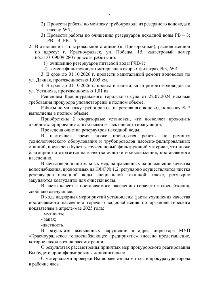 В ходе проверки прокуратура подтвердила ухудшение качества горячей воды по органолептическим показателям (цвет, мутность, запах). Также ранее, по результатам аналогичных обращений, суд уже обязал муниципальные предприятия провести капитальные работы на ряде объектов водоснабжения — от замены фильтрующих материалов до ремонта водоводов. Часть работ уже начата и частично завершена, но полное восстановление системы и улучшение качества воды ожидается не ранее октября 2026 года.