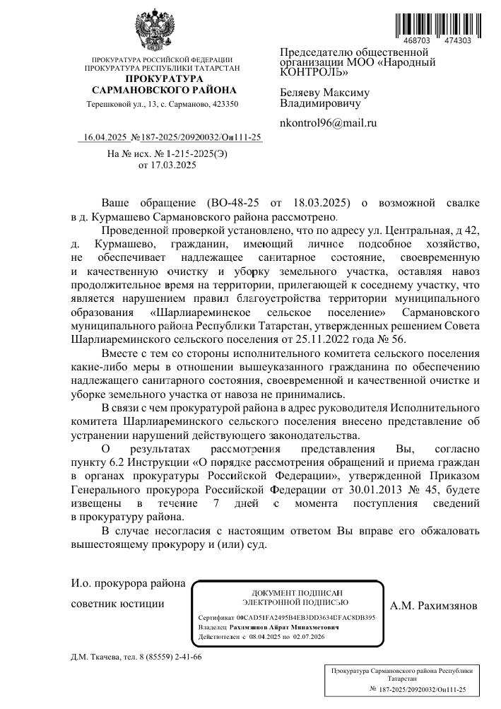 Благодарим неравнодушных граждан за Ваши обращения. Если Вы не согласны с данным ответом Прокуратуры Сармановского района, пожалуйста, сообщите об этом Нам (желательно с фото/видео доказательствами выполнения работы в неполном объеме или ее невыполнении).