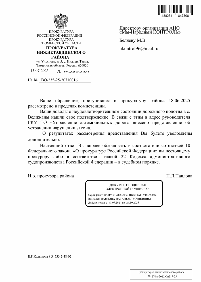 Благодарим неравнодушных граждан за Ваши обращения. Если Вы не согласны с данным ответом прокуратуры Нижнетавдинского района, пожалуйста, сообщите об этом Нам (желательно с фото/видео доказательствами выполнения работы в неполном объеме или ее невыполнении).