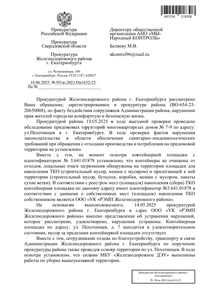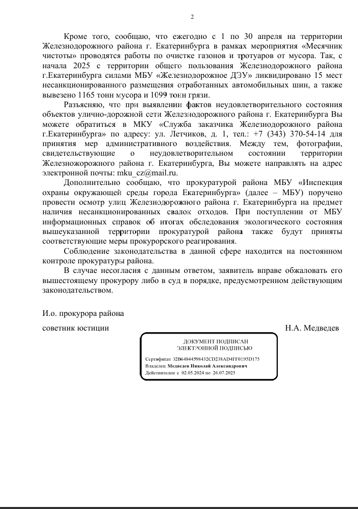 Благодарим неравнодушных граждан за Ваши обращения. Если Вы не согласны с данным ответом Прокуратуры Железнодорожного района города Екатеринбурга, пожалуйста, сообщите об этом Нам (желательно с фото/видео доказательствами выполнения работы в неполном объеме или ее невыполнении).