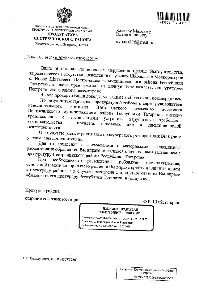 Прокуратура потребовала восстановить освещение в Новом Шигалеево