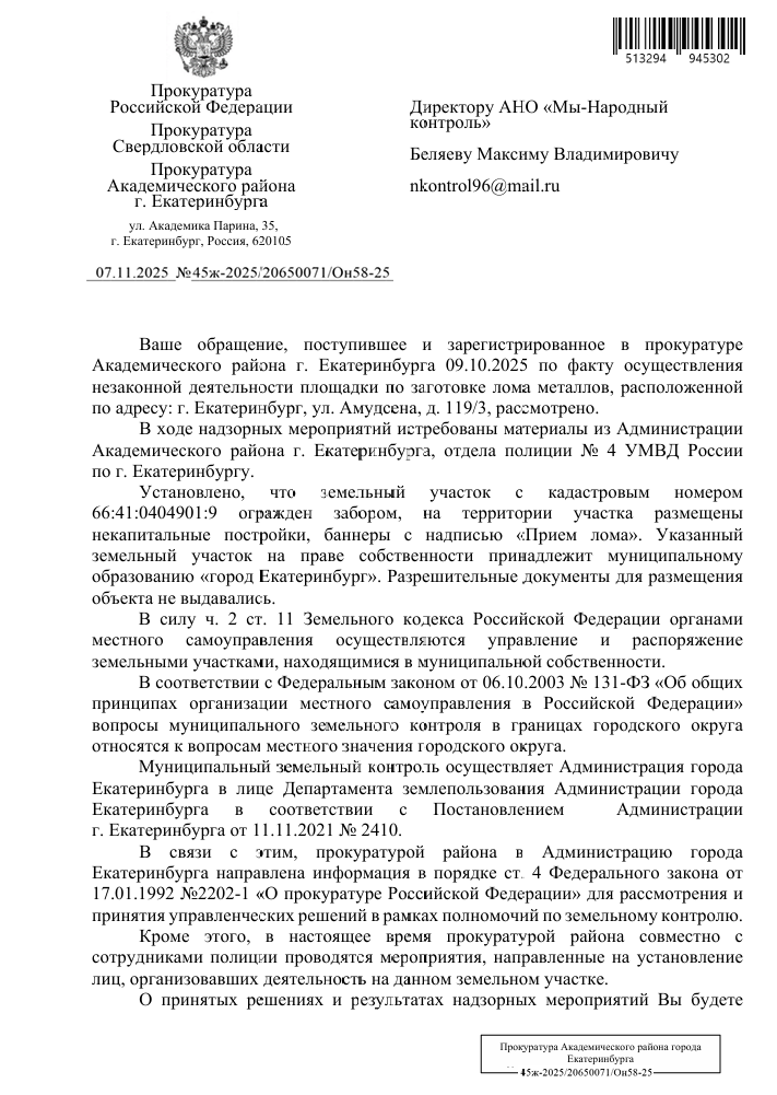 Установлено, что разрешительные документы отсутствуют, а земельный участок используется без правовых оснований. Прокуратура направила информацию в администрацию Екатеринбурга для принятия мер и совместно с полицией устанавливает владельцев пункта. Однако конкретных сроков по ликвидации объекта в ответе не указано, что вызывает вопросы о реальной эффективности принимаемых мер.