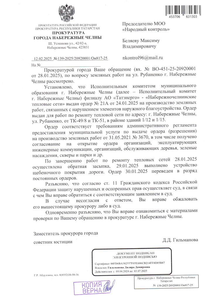 Прокуратура города рассмотрела обращение и установила, что земляные работы проводились на основании ордера, выданного Исполнительным комитетом города.