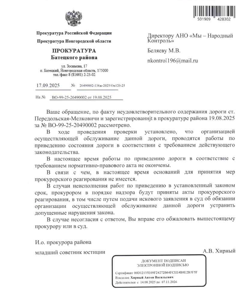 Благодарим неравнодушных граждан за Ваши обращения. Если Вы не согласны с данным ответом Прокуратуры Батецкого района , пожалуйста, сообщите об этом Нам (желательно с фото/видео доказательствами выполнения работы в неполном объеме или ее невыполнении).
