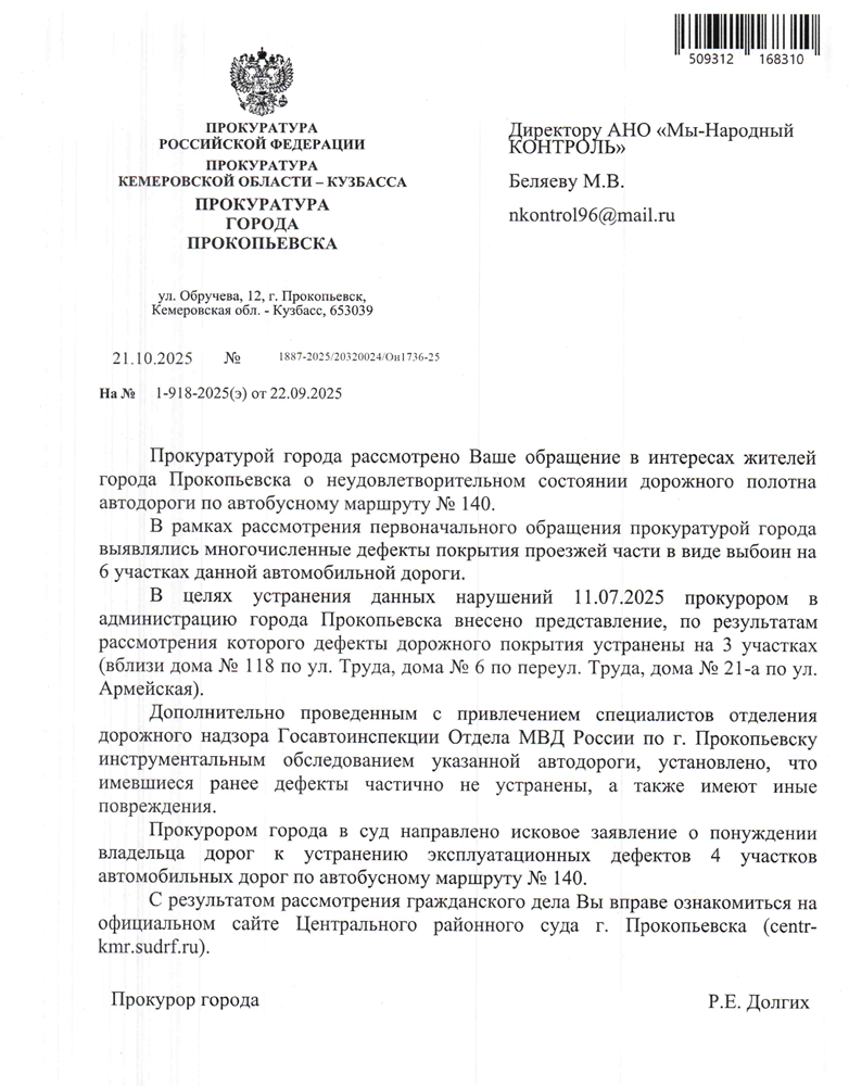 По этому вопросу был получен новый ответ от прокуратуры города Прокопьевска.