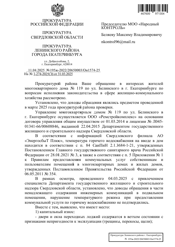 Благодарим неравнодушных граждан за Ваши обращения. Если Вы не согласны с данным ответом Прокуратуры Ленинского района города Екатеринбурга, пожалуйста, сообщите об этом Нам (желательно с фото/видео доказательствами выполнения работы в неполном объеме или ее невыполнении).