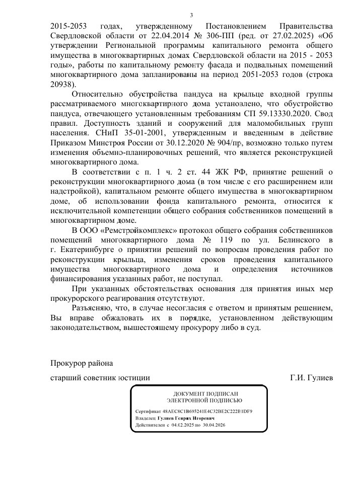 Средства капремонта находятся у регоператора, сами работы запланированы на 2051–2053 годы. Устройство пандуса и проведение капремонта возможно только по решению общего собрания собственников.