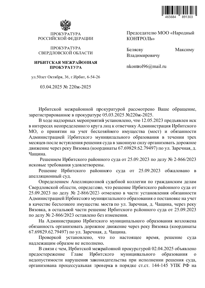 В ходе проверки выяснилось, что еще в мае 2023 года был подан иск к Администрации Ирбитского муниципального образования. Жители требовали признать мост бесхозяйным имуществом и обязать администрацию в течение трех месяцев организовать движение по мосту через реку Вязовка. Иск был удовлетворен в сентябре 2023 года.