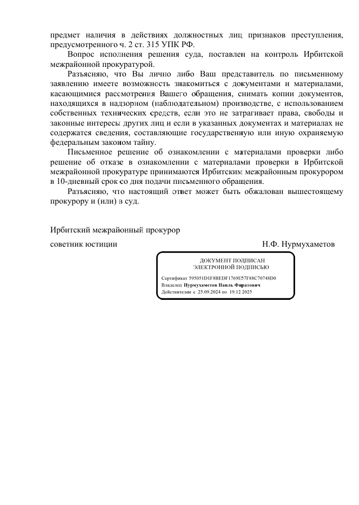 Из-за неисполнения решения суда прокуратура в апреле 2025 года вынесла предостережение Главе Ирбитского муниципального образования, а также начала проверку на предмет возможных преступлений со стороны должностных лиц. Этот вопрос теперь находится на контроле прокуратуры.
