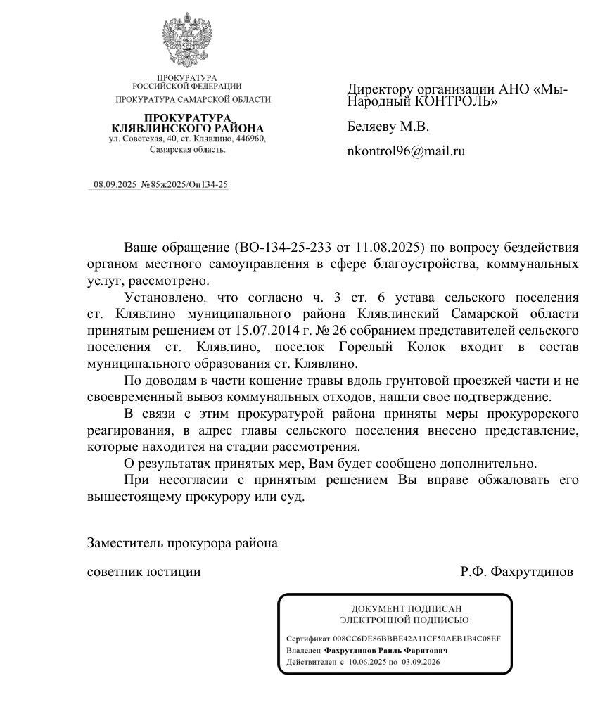 В ответе прокуратуры указано, что поселок Горелый Колок юридически входит в состав сельского поселения Станция Клявлино. Нарушения в части отсутствия кошения травы вдоль дорог и несвоевременного вывоза мусора подтвердились. Прокуратура внесла представление главе сельского поселения, требующее устранить нарушения.