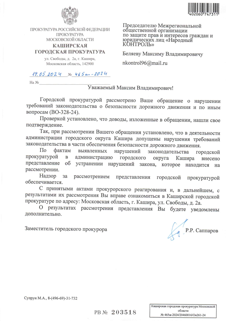 Городской прокуратурой рассмотрено Ваше обращение о нарушении требований законодательства о безопасности дорожного движения и по иным вопросам (ВО-328-24).