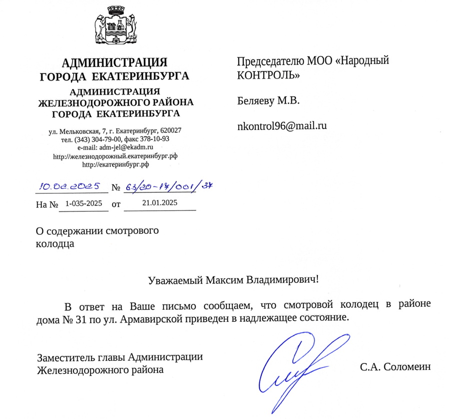 По итогам рассмотрения в официальном ответе Администрации Железнодорожного района города сообщается, что смотровой колодец приведен в надлежащее состояние.