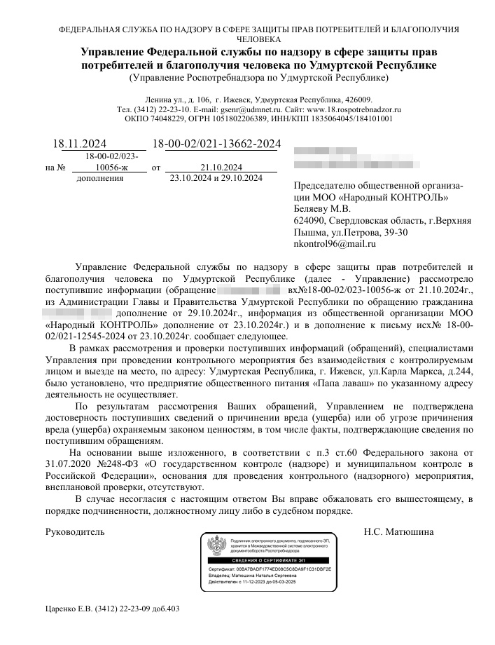 Проверка «Папа Лаваш» в Ижевске: деятельность по указанному адресу не выявлена