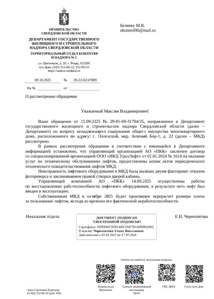В официальном ответе Департамента государственного жилищного надзора Свердловской области подтверждается, что неисправность лифта была вызвана техническими причинами — отказом системы безопасности (фотореверса) и заклиниванием двери кабины.