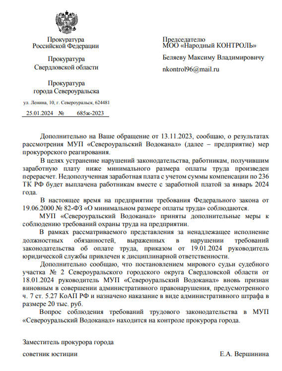 За ненадлежащее исполнение должностных обязанностей руководитель юридической службы привлечен к дисциплинарной ответственности. Руководитель МУП «Североуральский Водоканал» признан виновным в административном правонарушении и назначен административный штраф в размере 20,000 рублей.