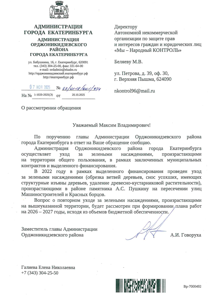 На обращение был получен ответ от администрации Орджоникидзевского района города Екатеринбурга.