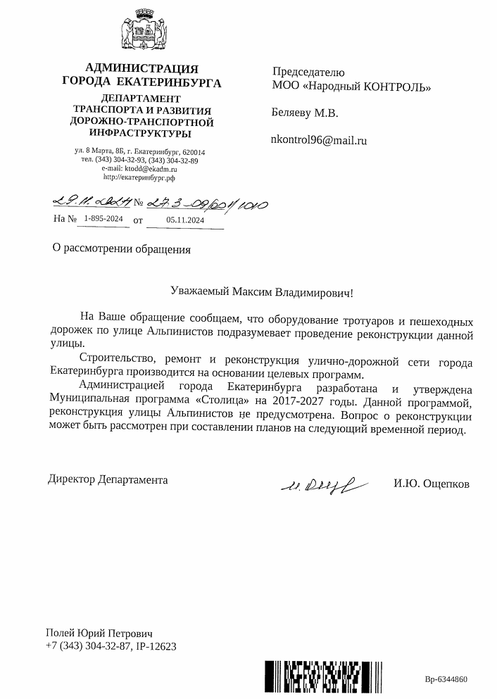 В ответ на обращение администрация города Екатеринбурга пояснила, что реконструкция улицы Альпинистов, включая устройство тротуаров и пешеходных дорожек, не предусмотрена действующей муниципальной программой «Столица» на 2017-2027 годы. Вопрос о проведении работ может быть рассмотрен в рамках составления планов на следующий период.