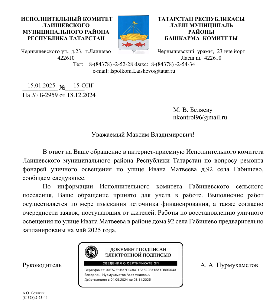 В ответ на запрос Исполнительный комитет Лаишевского муниципального района сообщил, что обращение принято в работу. Однако восстановление освещения будет возможно только при наличии финансирования и с учетом очередности заявок. Предварительно работы запланированы на май 2025 года.