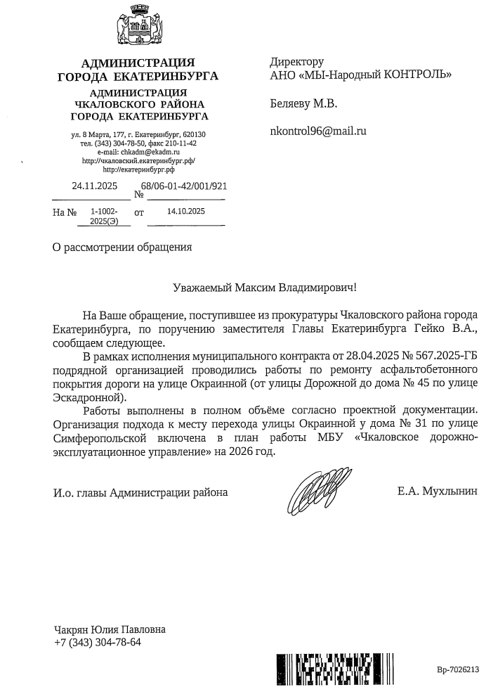 Администрация сообщила, что ремонт асфальтобетонного покрытия на улице Окраинной от улицы Дорожной до дома № 45 по улице Эскадронной был выполнен в полном объеме в рамках муниципального контракта. Организация подхода к пешеходному переходу возле дома № 31 по улице Симферопольской включена в план работы МБУ «Чкаловское дорожно-эксплуатационное управление» на 2026 год.