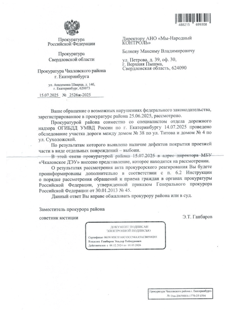 Результаты прокурорской проверки: дорога на перекрестке улиц Титова и Сухоложская требует ремонта