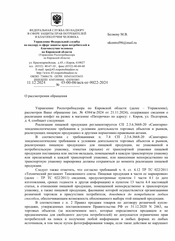 Роспотребнадзор ответил на жалобу по маркировке конфет в магазине «Пятёрочка» в Кирове