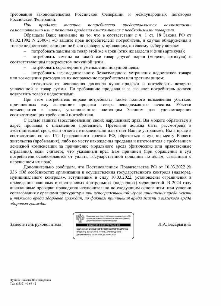 Роспотребнадзор напомнил, что покупатели могут потребовать замены товара, устранения его недостатков или возврата денег в случае выявления нарушений. В случае неудовлетворительного ответа на письменную претензию к продавцу граждане вправе обратиться в суд для защиты своих прав, включая компенсацию морального вреда.