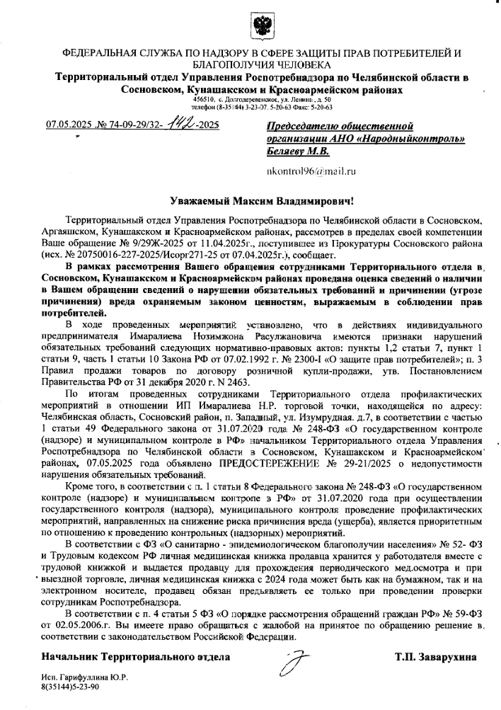 В конце марта общественники из «Народного контроля» и Русской общины провели выездной мониторинг заведения на ул. Изумрудная, 7 в поселке Западный Челябинского городского округа. Условия, в которых там велась торговля, вызвали серьезные вопросы: антисанитария, просроченные продукты, отсутствие канализации и воды, работа без перчаток. Медкнижку продавец на проверке не предъявила.
