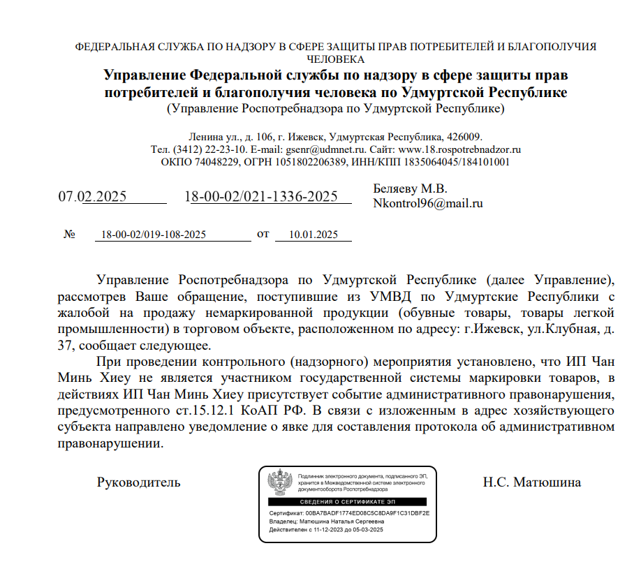 В ноябре 2024 года было получено два обращения из Ижевска, касающиеся продажи немаркированной обуви и одежды.
