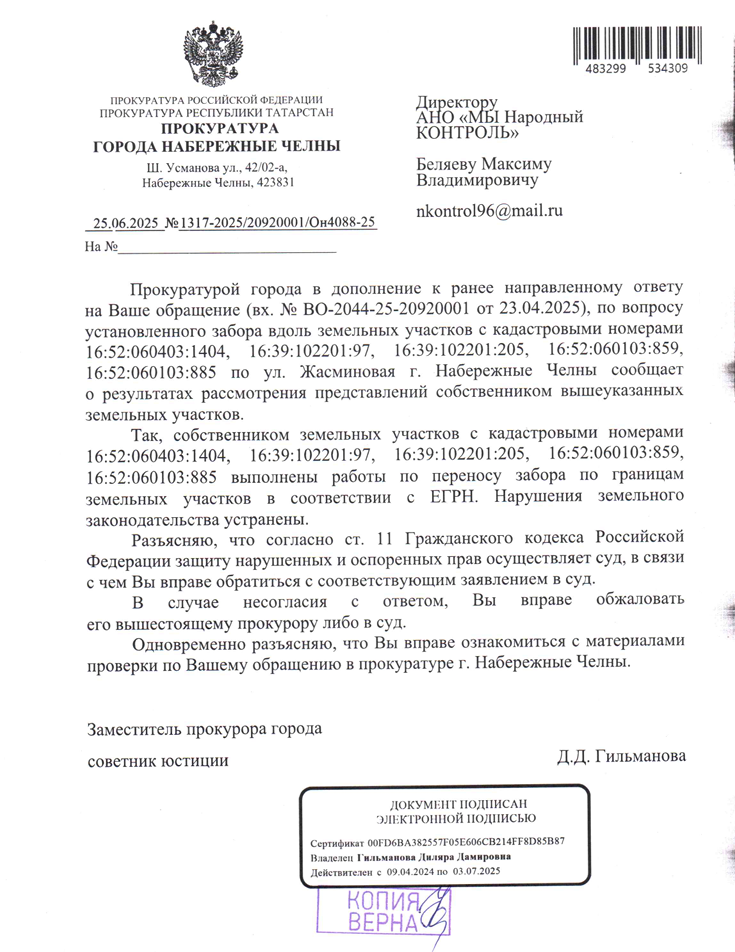 В новом ответе прокуратуры указано, что забор перенесён в пределах границ участков согласно сведениям ЕГРН, и выявленные нарушения земельного законодательства устранены.