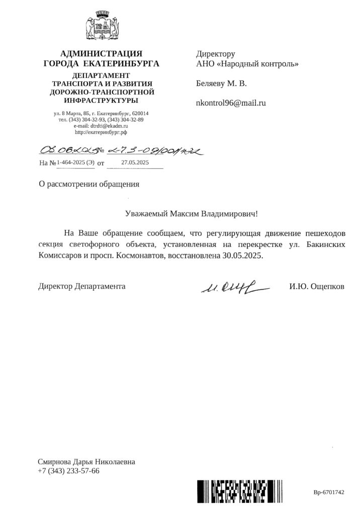 Публикуем ранее поступивший ответ по обращению жителей Екатеринбурга по вопросу восстановления работы светофора по улице Бакинских Комиссаров и просп. Космонавтов.