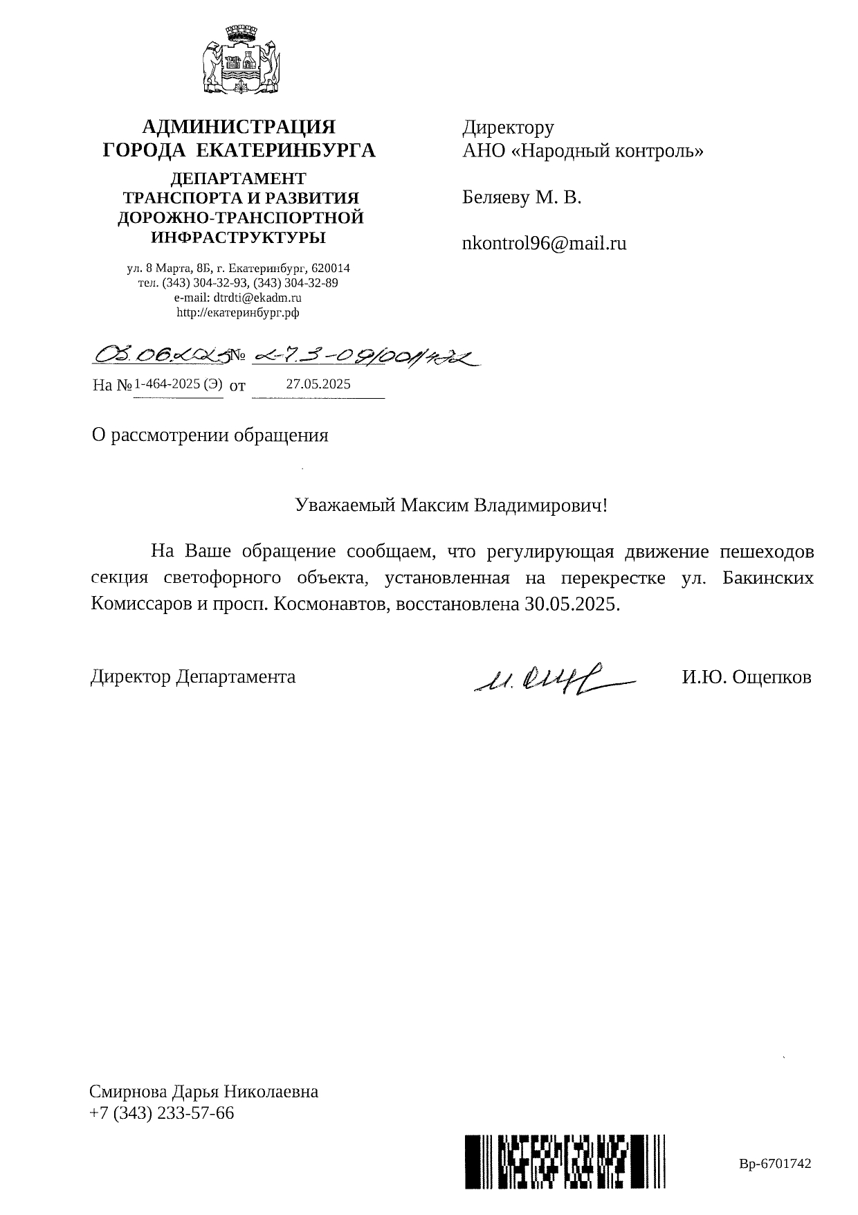 Публикуем ранее поступивший ответ по обращению жителей Екатеринбурга по вопросу восстановления работы светофора по улице Бакинских Комиссаров и просп. Космонавтов.