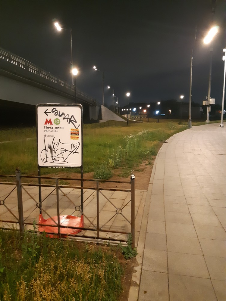 10 июня 2024 года. Москва, улица Шоссейная, дом 1/3. Разрисован указатель к метро между станциями БКЛ и МЦД.