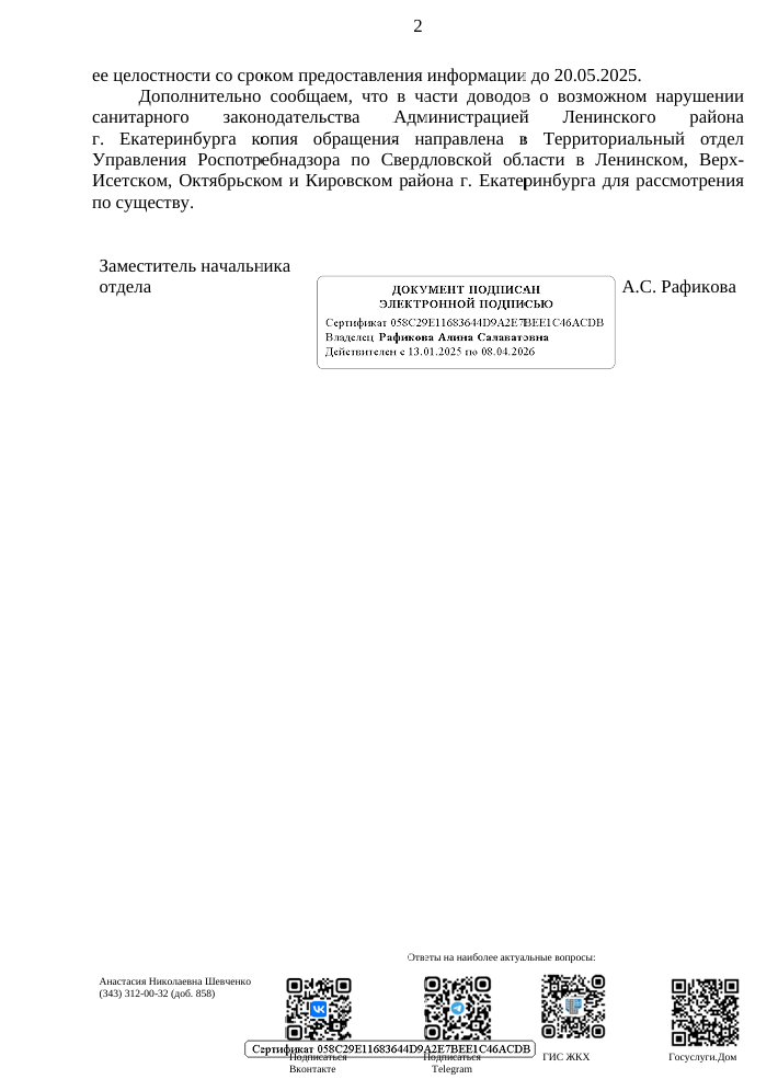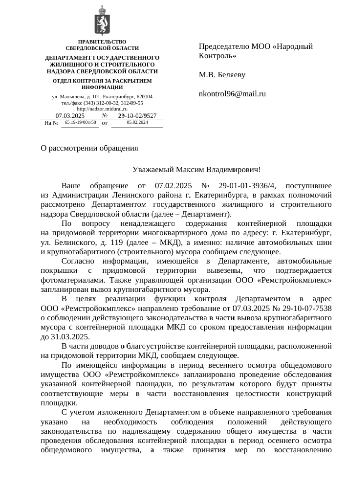Ответ на обращение был получен от Департамента государственного жилищного и строительного надзора Свердловской области.