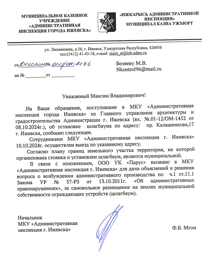Административная инспекция Ижевска провела проверку 10 октября 2024 года. Согласно результатам выезда, было установлено, что территория, на которой размещена стоянка и установлен шлагбаум, является муниципальной. Управляющая компания «Парус», ответственная за установку ограждения, была вызвана для дачи объяснений.